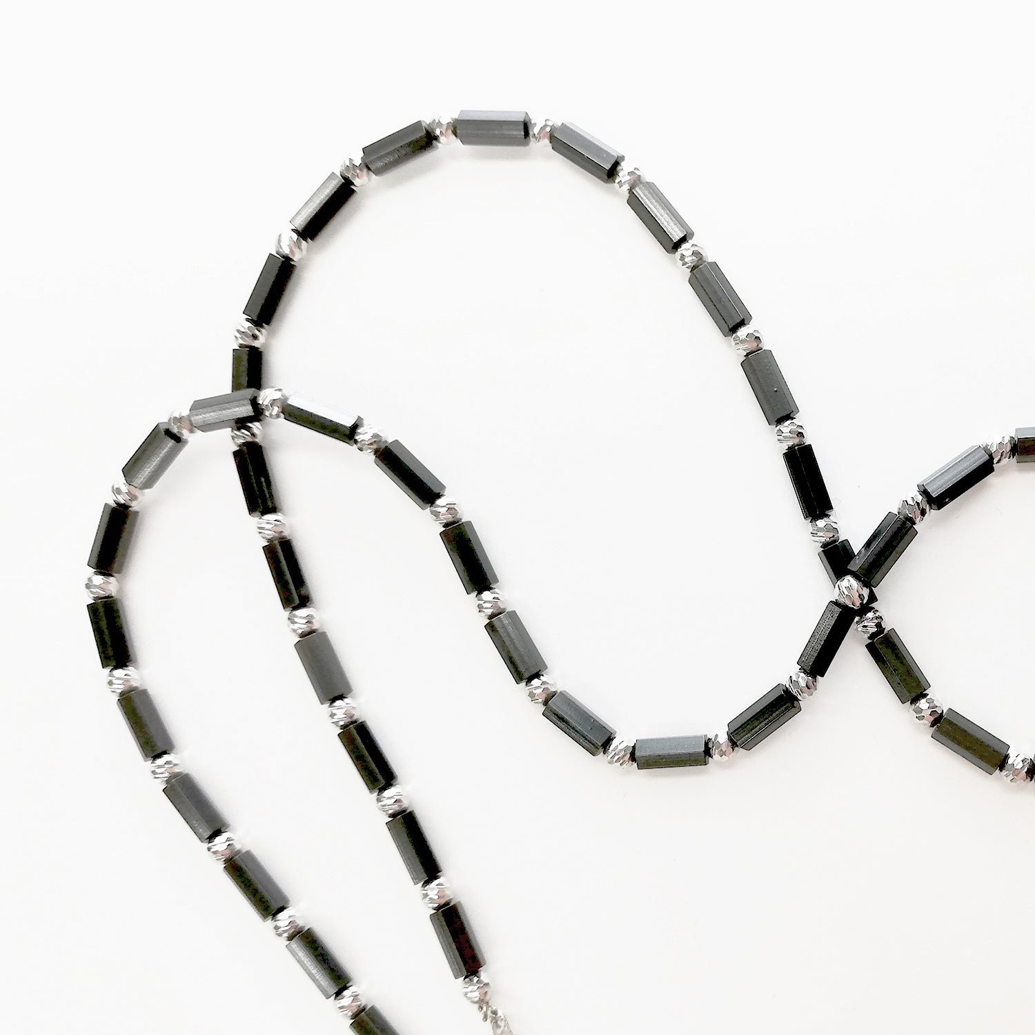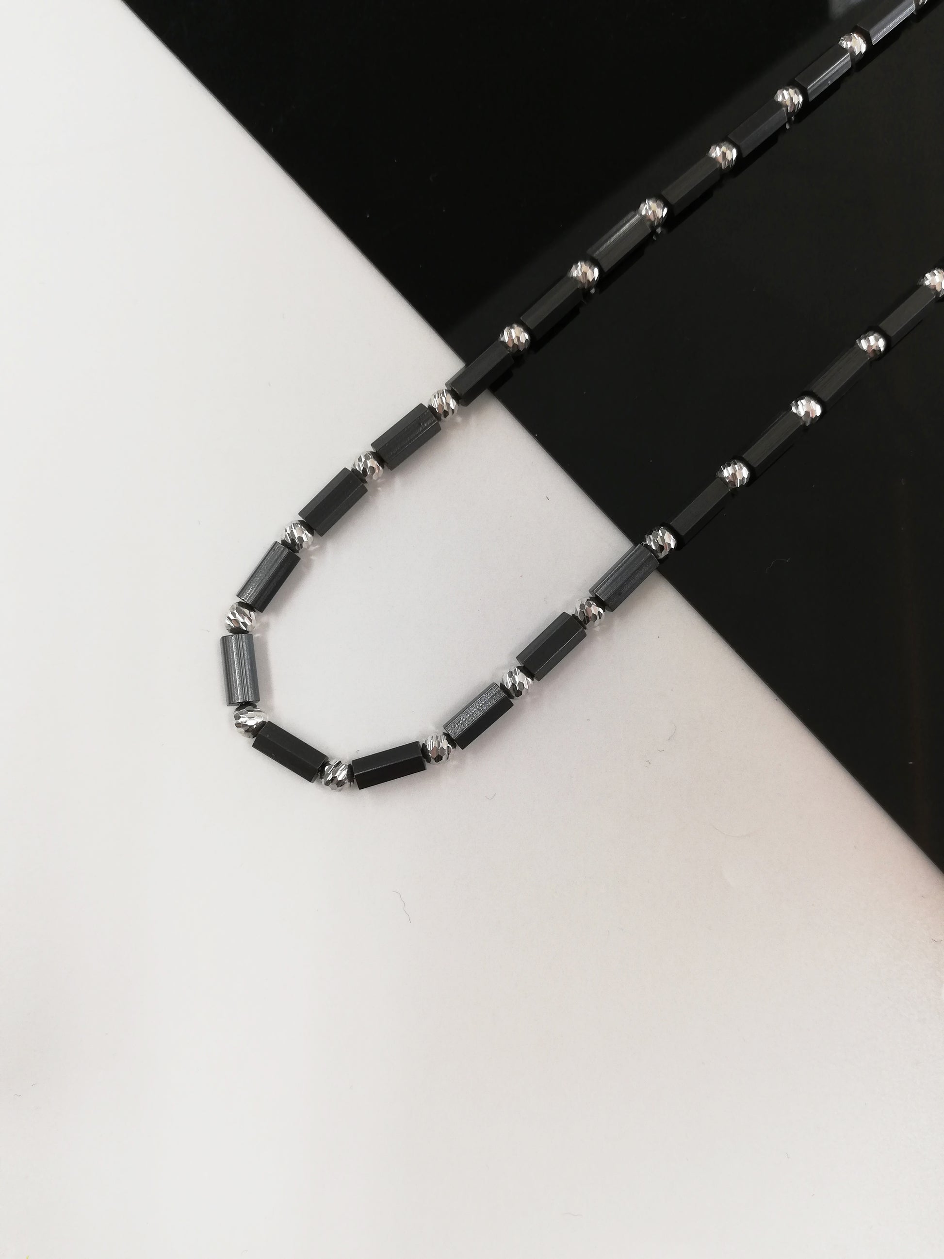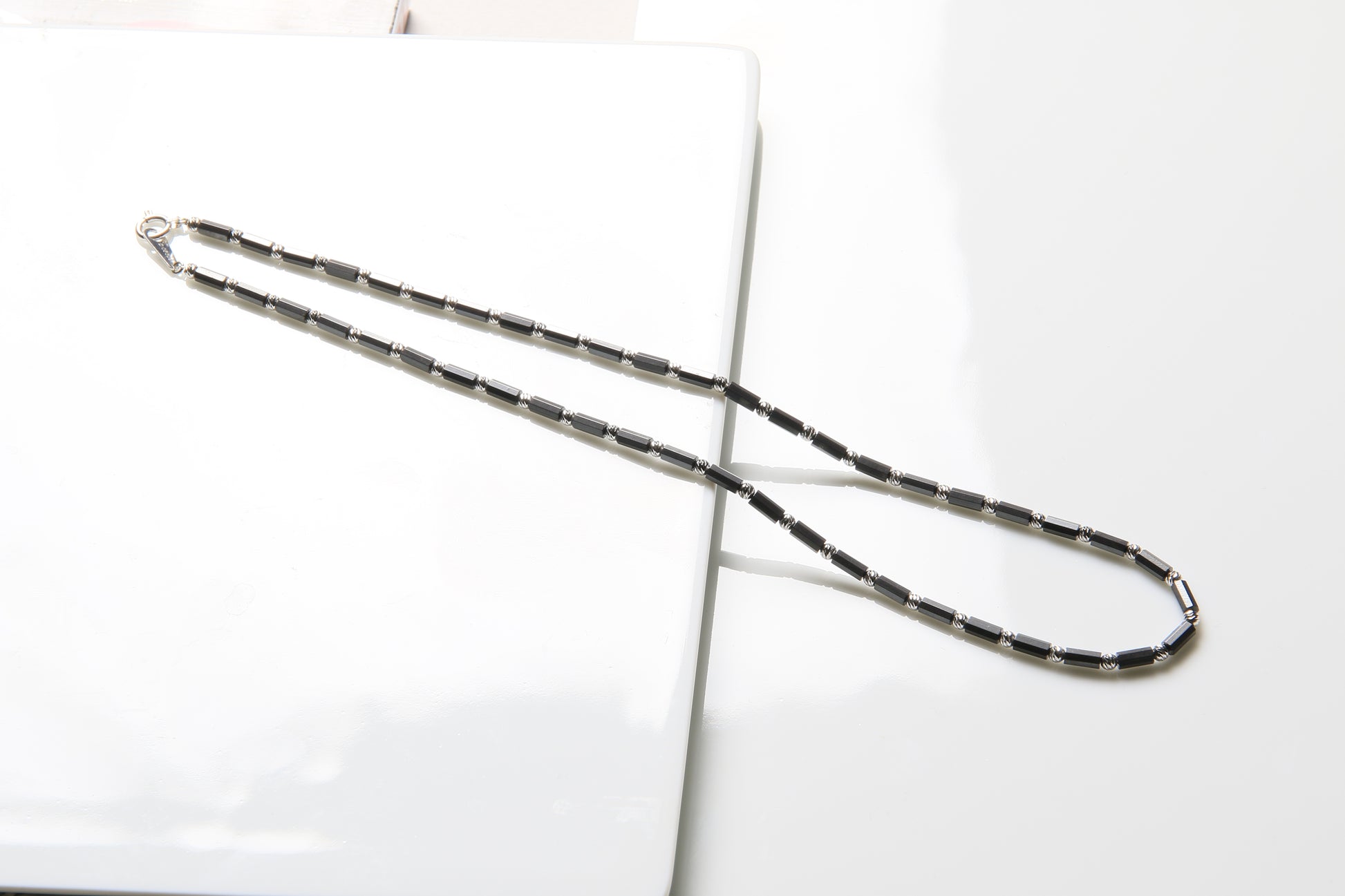中線にはサージカルステンレスチェーンを使い、角柱の間にはミラーボールカット用の18金のパーツを挟んでいます。