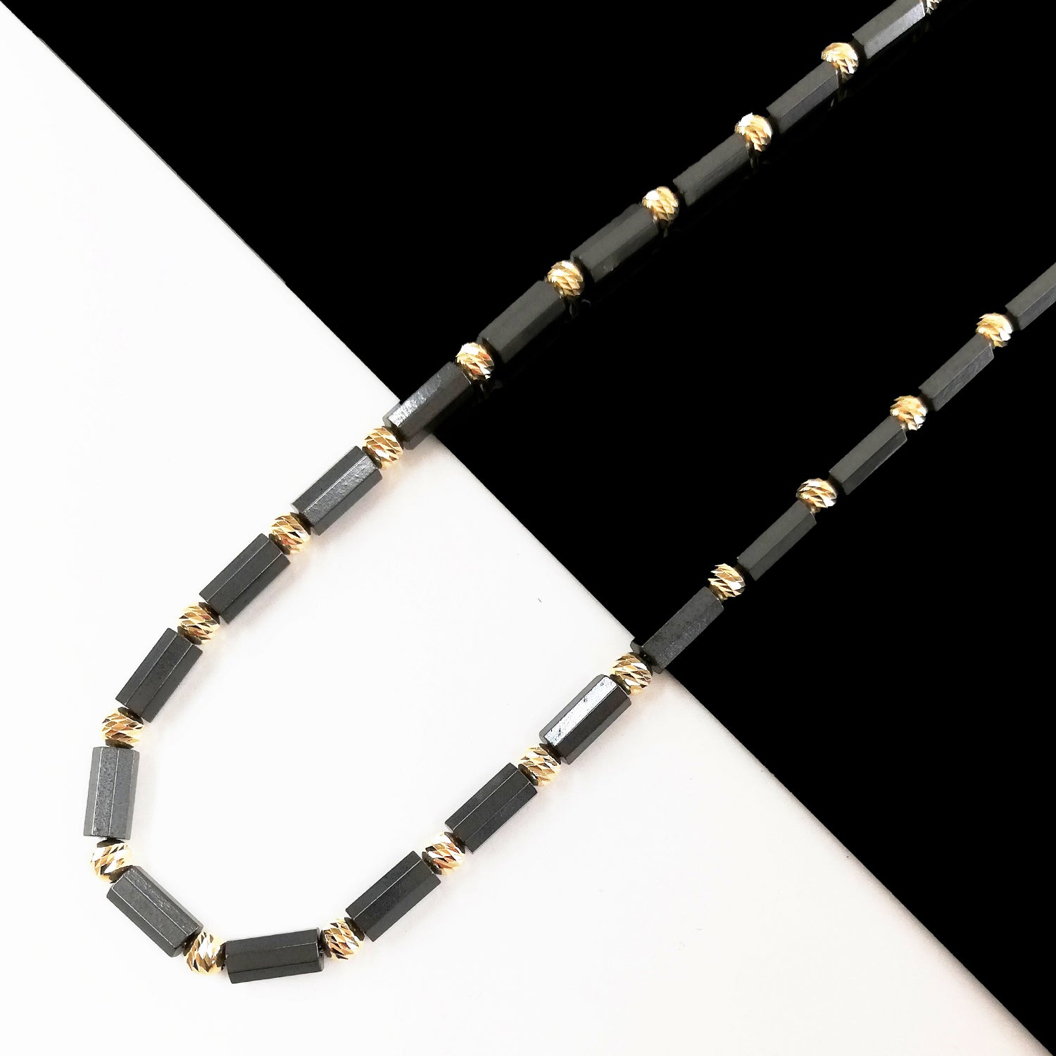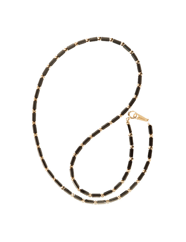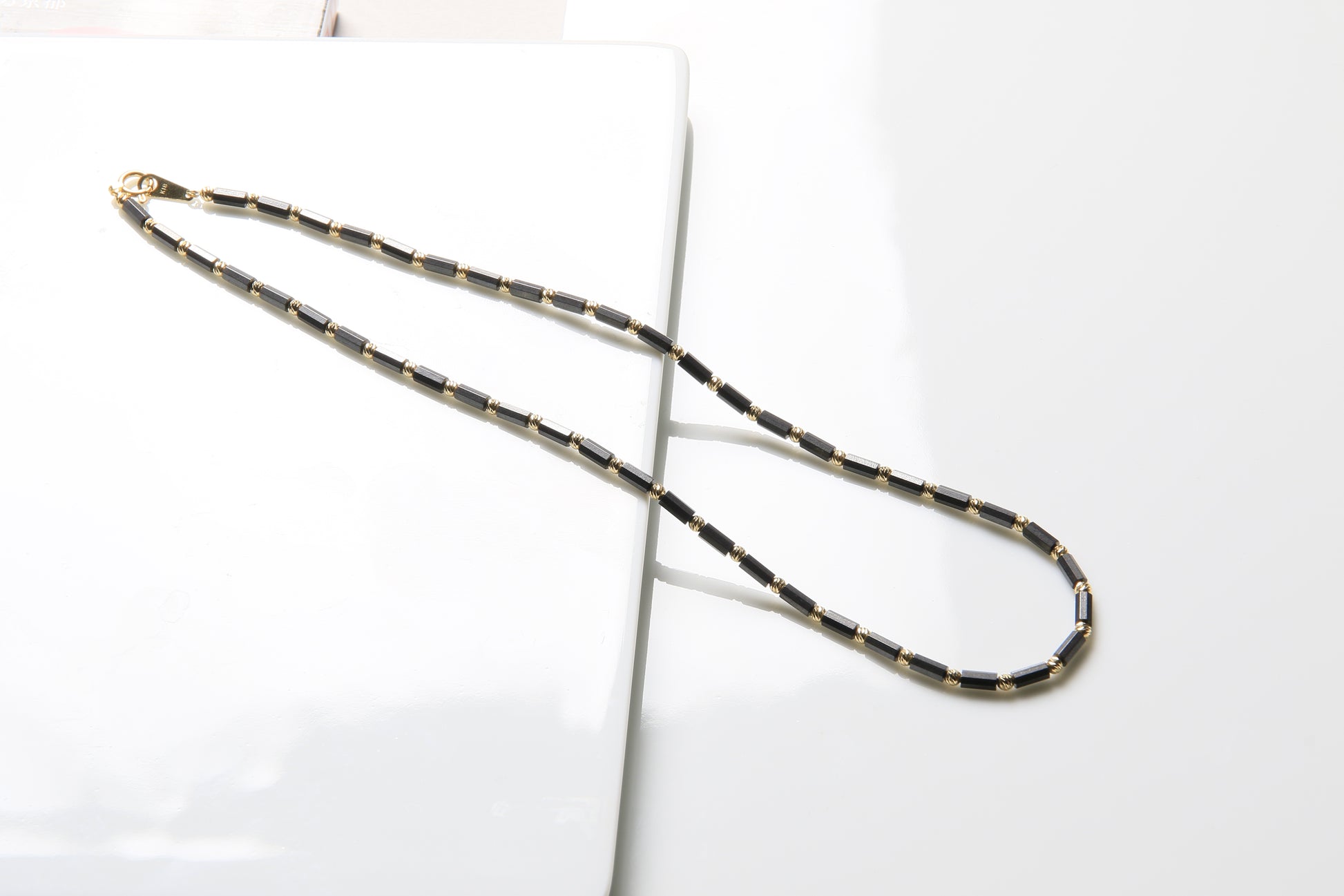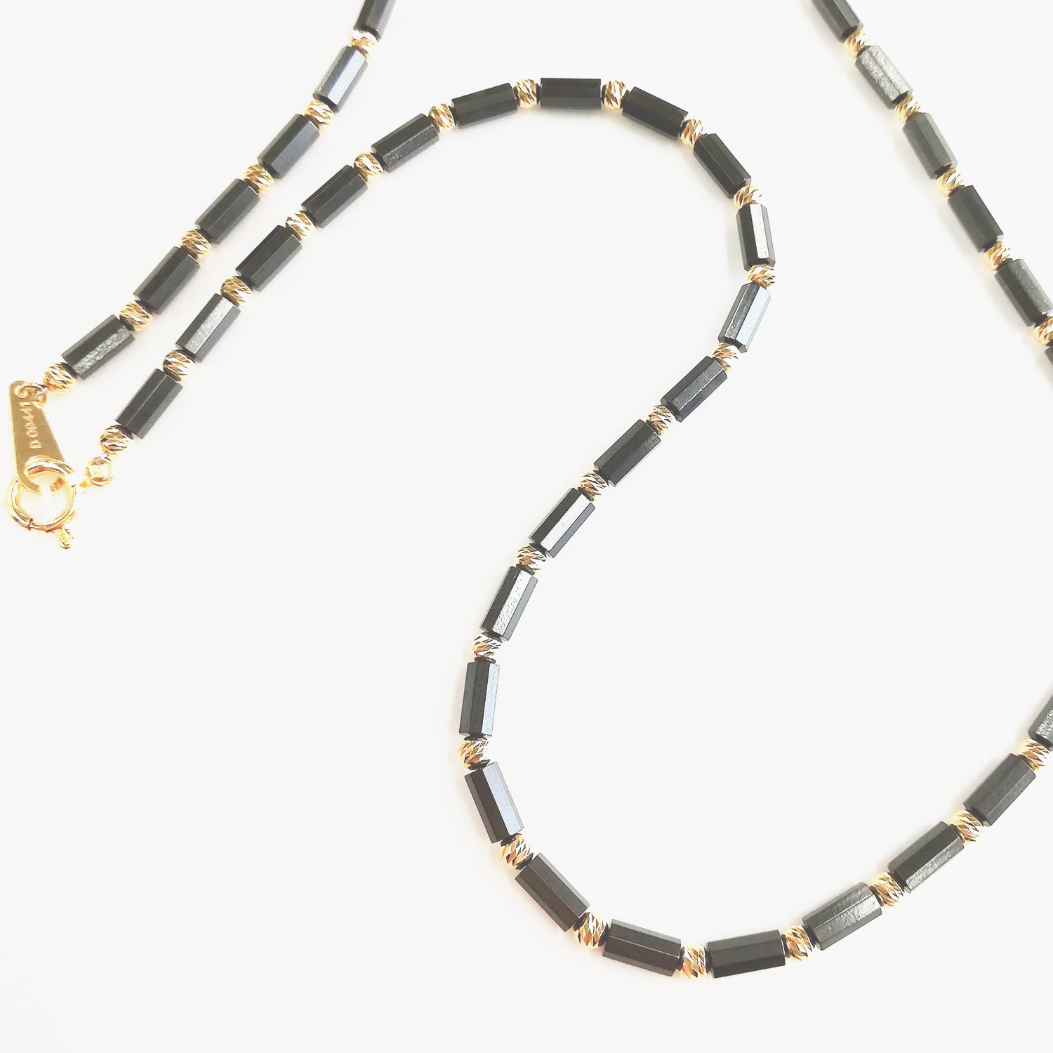 中線にはサージカルステンレスチェーンを使い、角柱の間にはミラーボールカット用の18金のパーツを挟んでいます。