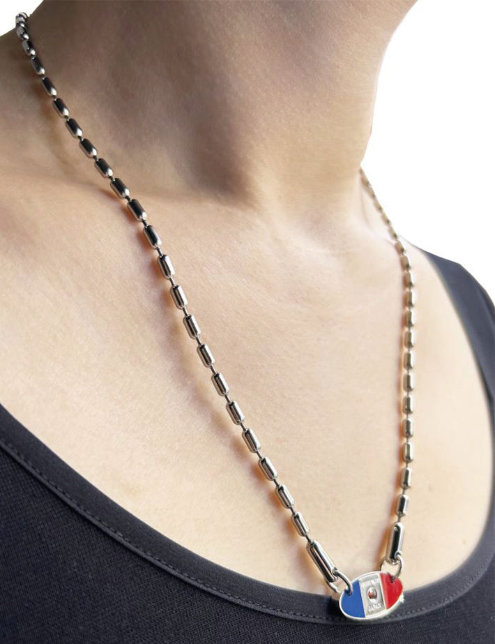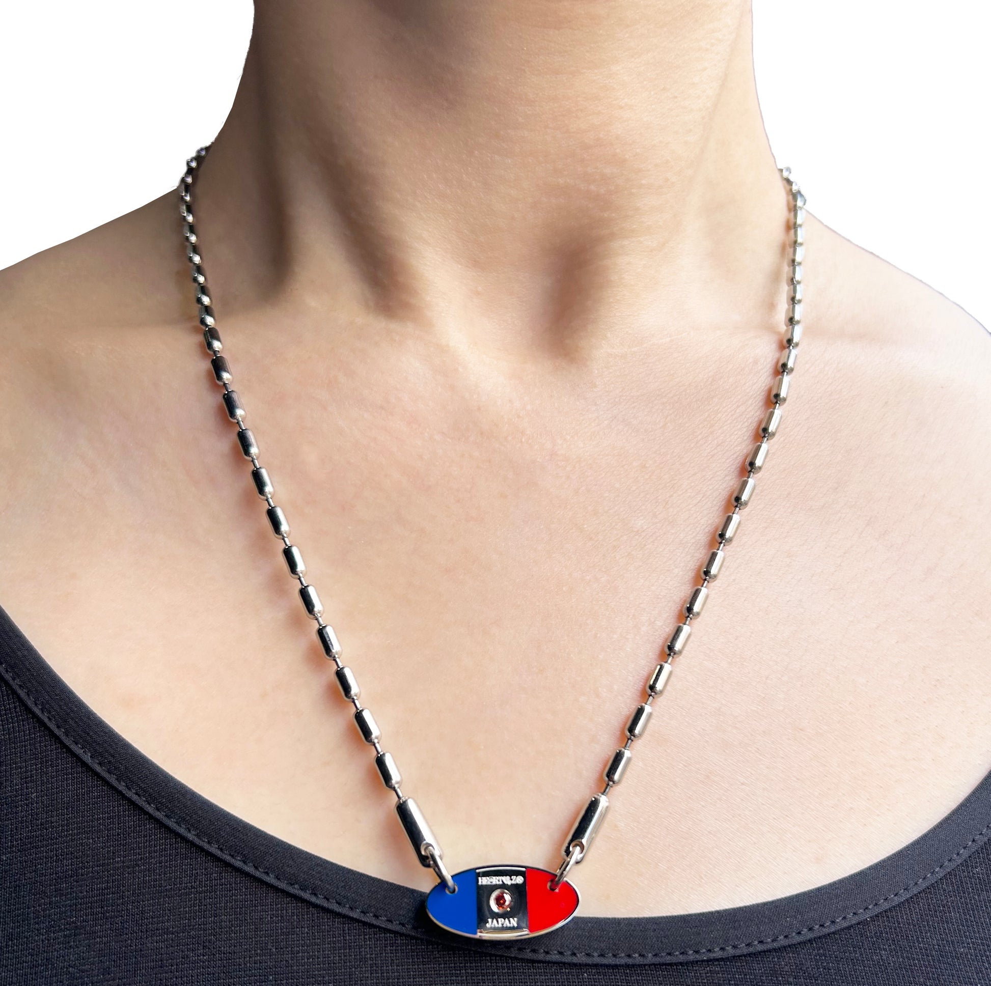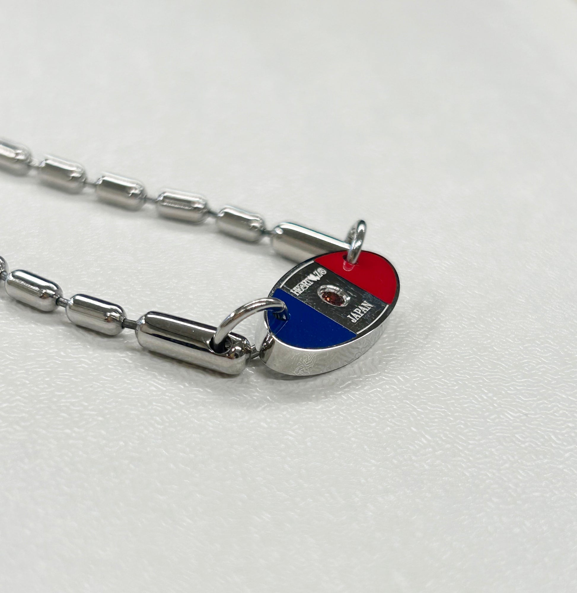 従来の「メタリックネックレス Ⅱ 」を基本に、「ハーツストーン」をクリアからレッドへ変更し、トップを3分割して左右をレッドとブルーのエポキシ樹脂にて色付けしたデザインです。