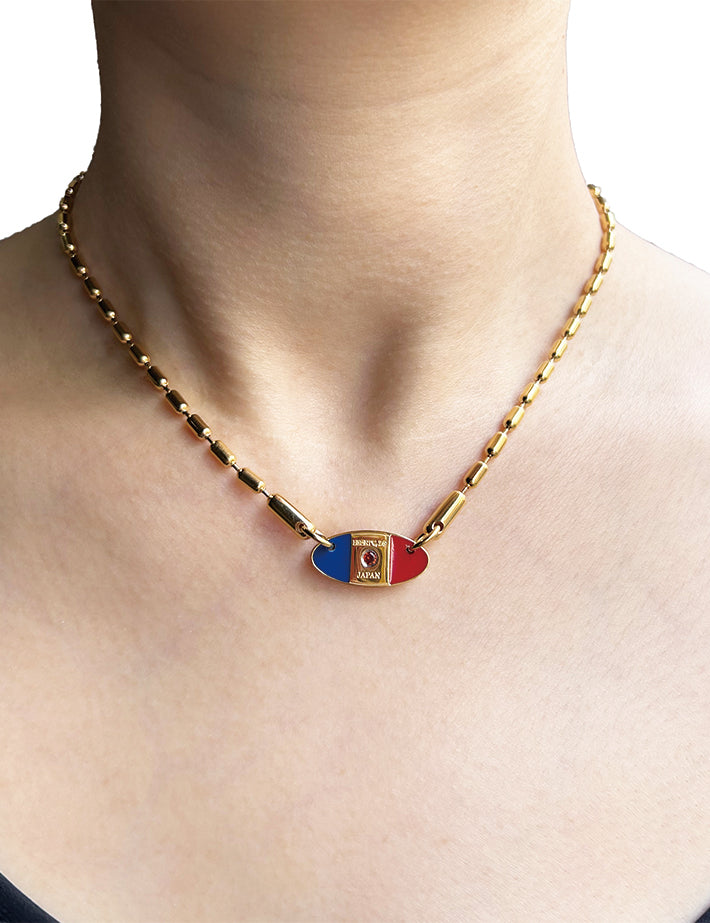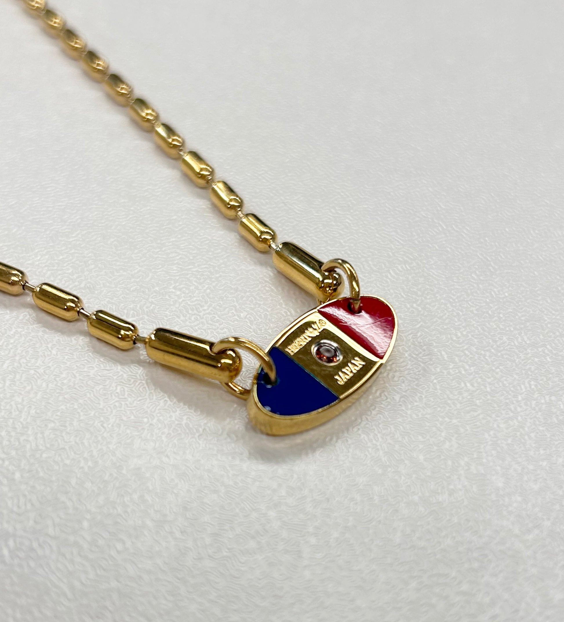 従来の「メタリックネックレス Ⅱ 」を基本に、「ハーツストーン」をクリアからレッドへ変更し、トップを3分割して左右をレッドとブルーのエポキシ樹脂にて色付けしたデザインです。